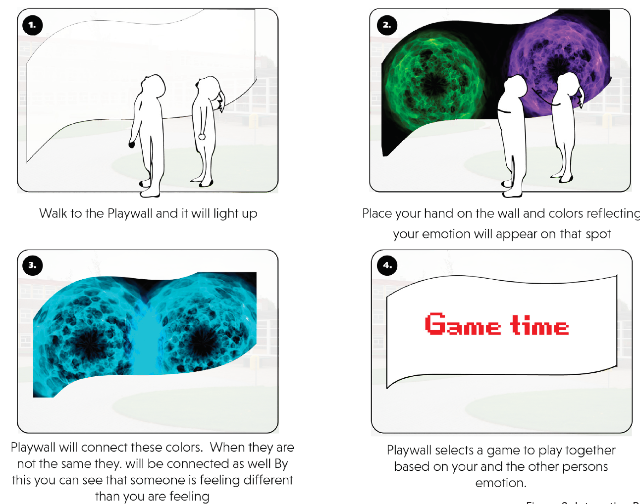 The idea behind The Playwall is that it is an interactive curved wall which can determine emotions of the children. When someone puts their hand on the wall, their emotion is determined and the wall will light up in a random color. Children with the same emotion get the same color. The colors do, however, not correspond to a certain emotion. When two children touch the Playwall, two circles with different or same colors appear. This shows the children that someones emotion is the same or different than his or herself. They can talk about it and choose a game that they can play together on the Playwall. This concept lets children play games with each other while simultaneously learning about the emotions of others. The Playwall stimulates working together and talking to each other in order to complete the games.